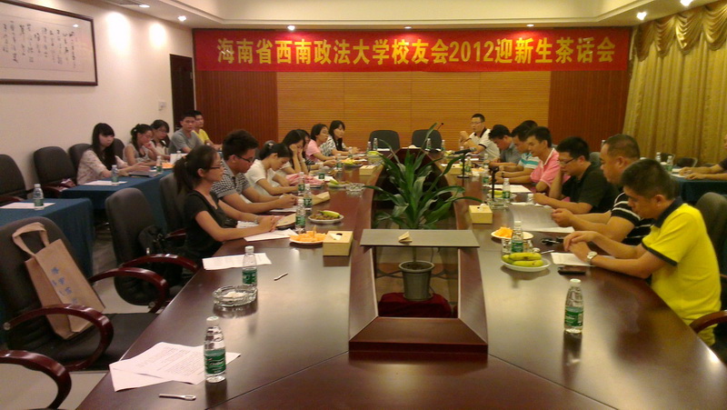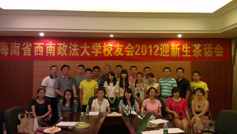 2012年8月19日,海南省西南政法大学首届迎新生茶话会在锦鸿温泉花园酒店召开。     茶话会上,新老校友欢聚一堂。会议的开始,秘书长赵弈涵介绍了西南政法大学的基本概况与海南校友会的建设情况。会议第二部分,轮到新老校友自我介绍。新生介绍完毕,师兄师姐发言时,各个感慨万千,并以自己亲身经历为例,教育年轻的师弟师妹该如何更好地度过大学四年时光,有意识地规划自己的未来,创造理想的明天!副会长程宏还激动地拿出自己当年的毕业证书,回忆着年轻时的经历。在座的师弟师妹无不在师兄师姐的讲述中体会到关爱,并深深地凝聚在西政这个大家庭里。 校友合影 副会长程宏讲话 新生自我介绍 在校生代表发言 嘉宾发言 会后,新老校友共进晚餐 副会长陈勇和校友交流 副会长程宏和师弟师妹相互敬酒 更多会议图片请点击此处 http://www.swuplhn.com/news/view.asp?id=159