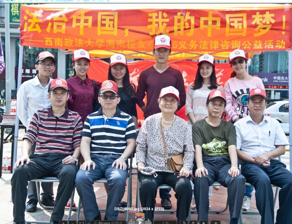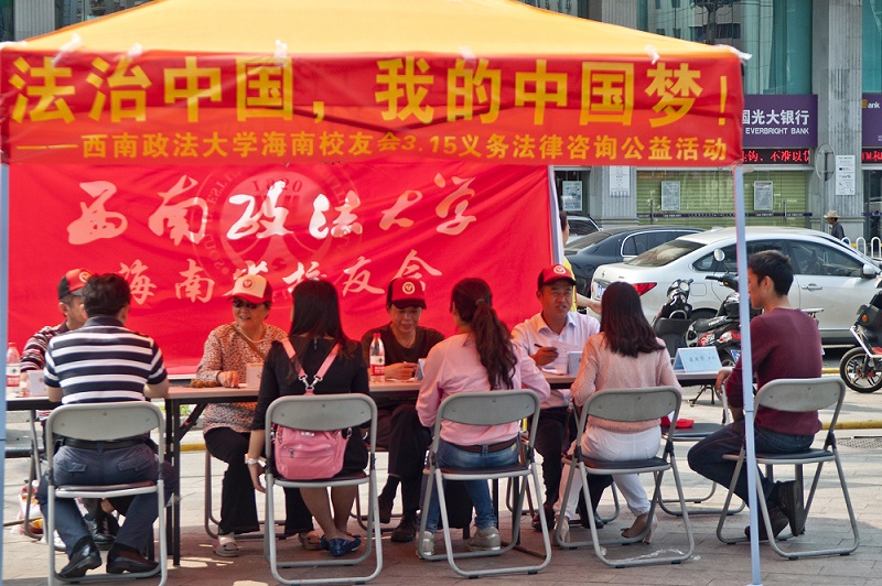 (撰稿:张馨玟 摄影:黄文智)为了普及消费者权益保护有关法律知识,增强普通消费者利用法律保护自身权益的能力,经有关部门批准,2015年3月15日上午,西南政法大学海南校友会联合海南方圆律师事务所、海南经和纬律师事务所、海南富安律师事务所、海南昌宇律师事务所在海口市名门广场开展了“法治中国,我的中国梦”3.15法律咨询公益活动。中国专家库专家西政62级谭伦师姐、海南知名律师83级邓锐师兄、海南知名法律援助人士88级潘国威师兄、93级张德兴校友、00级易淼校友、01级黄文智校友、03级(研)辛欣校友、04级何锦秀校友、08级邱萧红校友、10级陈其帅校友、10级李燕校友等近15名学者、律师、志愿者校友参加活动,78级杨伟余师兄专程到活动现场看望慰问了参加活动的校友。校友会吴贵仲执行秘书长、林挺莉副秘书长在现场主持活动的具体工作。      活动为消费者普及了知情权、选择权等主要消费者权益的内容和维权知识,接受了现场民众关于商品房买卖、商场消费、物业纠纷、住房装修、网上购物等热点消费法律问题的咨询,同时还解答了民众关于其他具体刑事、民事案件的法律咨询。     法律咨询公益活动获得社会广泛好评,海口电视台、海南交通广播等新闻媒体对活动进行了报道。