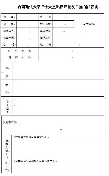 各校友会、律师校友联谊会董事:     为弘扬西政精神,宣传律师校友在依法治国进程中涌现出的先进典型,西南政法大学和西南政法大学校友会决定,在全国律师校友中开展第三届西南政法大学“十大杰出律师”评选表彰活动(以下简称“评选活动”)。 一、组织领导      成立评选委员会,负责组织领导评选工作。评选委员会由13人组成,校长付子堂教授担任主任,部分省校友会负责人、省律协负责人、西南政法大学律师校友联谊会负责人组成评选委员会。 评选委员会下设办公室,办公室设在西南政法大学律师校友联谊会秘书处,西南政法大学律师校友联谊会常务副会长韦锋任办公室主任。 评选活动将与学校网站全程合作,由西南政法大学律师联谊会进行深度报道。 二、 评选名额      评选名额为10名。为充分体现评选活动的公开、公平、公正原则, “评选活动”拟定杰出律师推荐名额为30名。正式名额从推荐名额中评选产生,不受地区、性别等限制。 三、“十大杰出律师校友”评选条件 1、西南政法大学毕业的专科(函授)、本科、硕士和博士生均可参加评选。此外,在西南政法大学工作过的老师离校后从事专职律师职业的校友亦可参评。推荐和自荐者均需填写《西南政法大学“十大杰出律师”推(自)荐表》(见附件)。 2、政治素质好。拥护中国共产党的领导、拥护社会主义制度、拥护以习近平主席为首的党中央的正确领导;自觉维护法律的公正、维护当事人合法权利、维护安定团结的社会秩序。忠于宪法和法律,在律师工作中认真贯彻落实党的路线方针政策,积极服务经济建设发展与社会和谐稳定。 3、职业道德佳。作风正派,诚信执业,恪守职业道德和执业纪律,模范遵守《律师执业行为规范》;无违法违规执业记录和当事人投诉记录。服从、接受司法行政机关和律师协会的管理、监督、指导,积极参加行业活动。 4、业务素质硬。法律专业知识和服务技能强,具备独立办理复杂法律事务的能力。重视业务学习和理论研究,有两篇以上专业理论文章在省、市级以上报刊、杂志公开发表,曾受省、部级司法行政机关、律师协会表彰。 5、奉献精神强。积极参政议政、参与信访接待工作,超额完成法律援助案件;热心社会公益事业,积极开展助学、助残、扶贫、救灾等社会公益活动,在业内和社会有较高声誉。热心校友工作,关心母校发展,积极参加母校和本地区校友会组织的校友活动。 四、评选程序 (一)推荐或自荐:由各地校友会、西政律师联谊会董事负责做好本地推荐工作(欢迎符合条件的律师校友自荐)。 (二)评选委员会评审:评选委员会办公室收集整理材料,提交评选委员会阅审。评选委员会根据个人材料和考核报告,参照评选条件和要求,本着公开、公平、公正的原则,由委员投票评选,按得票多少,拟定正式表彰对象,报西南政法大学校长办公会审批。 (三)公示:西南政法大学审批后,将拟表彰人选在西政官网、校友网、律师校友网等媒体公示。公示期为7天。 (四)表彰:西南政法大学将适时召开颁奖大会。 五、时间安排(每两年评选一次,以下时间均为暂定) (一)3月30日~4月15日:推荐; (二)4月15日~5月15日:考核小组对推荐、自荐对象进行审核; (三)6月1日~6月7日:网上公示; (四)由西南政法大学择机进行颁奖仪式。 六、具体要求 (一)请各地校友会、各位联谊会董事高度重视推荐工作,严格按照标准认真进行推荐。 (二)坚持公开、公平、公正的原则,增强工作透明度,确保将成绩突出、品德高尚、校友公认、贡献大的优秀律师校友推荐出来。 (三)推荐表彰人必须填报评选活动推荐表(见附件2),并附2000字以内的事迹简介材料(附电子版)、能充分反映个人风貌的工作照或生活照(电子版)、参加各种公益活动和法律援助工作的证明材料、发表的论文和有关奖励证明材料复印件等,一律(可折叠)装订成册,一式两份。 联系人:王   群   023—67258662     龙光美   023-67258000      李晓艳   023-67258809         传真:023-67258997    邮箱:xzlslyh@163.com 附件:西南政法大学“十大杰出律师校友”推(自)荐表                                                              西南政法大学律师校友联谊会秘书处                                         2015年3月10日  附件: