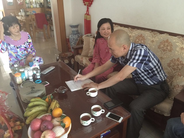 4月15日下午,公务出差到海南的西政广东校友会黄秋练常务副会长在海南校友会吴贵仲执行秘书长、办公室张馨玟主任陪同下,前往蔡娜校友家中看望了蔡娜校友和家人。黄秋练常务副会长为蔡娜校友精心准备了礼物,由于蔡娜校友听力失聪,黄秋练常务副会长通过纸笔书写的方式与蔡娜校友进行了特殊而亲切的交谈,向蔡娜校友转达了全体广东校友和母校老师的问候和祝福,向坚强的蔡娜家人致以了西政人的敬意。黄秋练常务副会长的到来让蔡娜校友和家人高兴异常,其捎来的母校老师和广东校友的祝福让蔡娜校友和家人倍感温暖。当日,蔡娜校友精神状况很好,兴致高昂的与黄秋练师兄谈天说地,并兴致勃勃拿出了自己珍藏的小工艺品赠送给黄秋练师兄。     为了不影响蔡娜校友的休养,短暂的相聚后,黄秋练常务副会长和我们一行匆匆告别蔡娜校友。离别时,大家依依不舍,蔡娜校友及家人将黄秋练常务副会长送到门外。我们已下了几级楼梯,蔡娜校友又把我们喊住说要合影!    当天早些时候黄秋练常务副会长、广东89级才子师兄刘仕毕校友还与海南校友会陈勇会长、冯必忠副会长、梁炯明理事、吴贵仲执行秘书长以及84级梁永新校友、92级张奇志校友、03级刘佳鹤校友欢聚一堂,就校友工作进行了交流,就如何进一步加强省级校友会间的交流合作进行了探讨.
